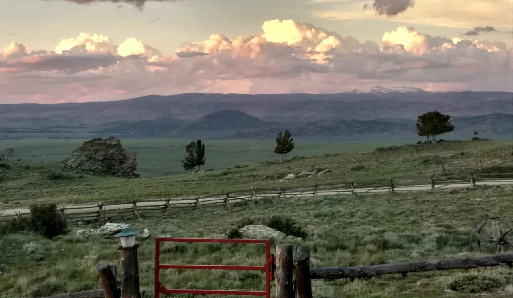 A rustic house on a cattle ranch is surrounded by green trees and fields, with a wooden fence in front and snow-capped mountains visible in the distance under a partly cloudy sky.