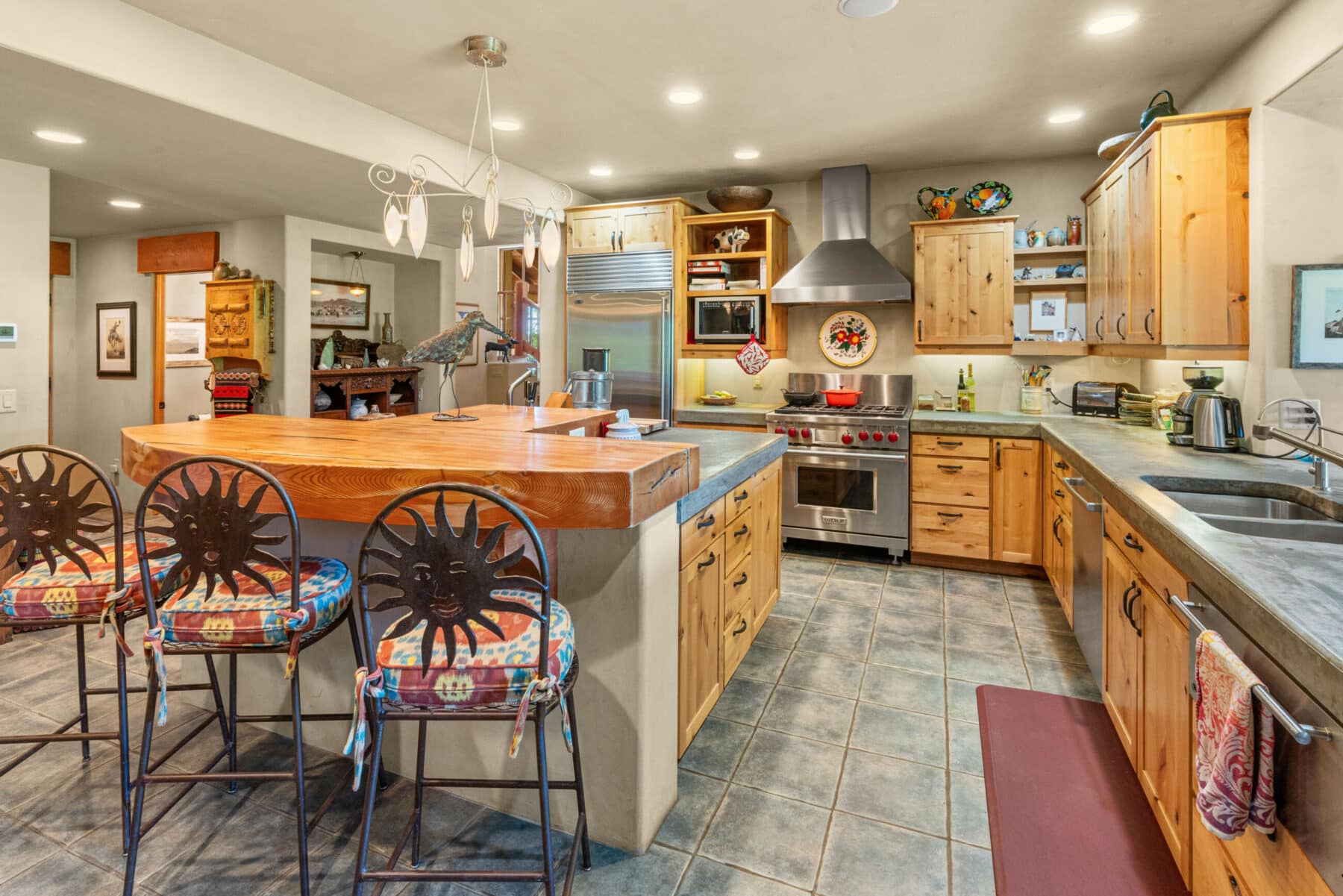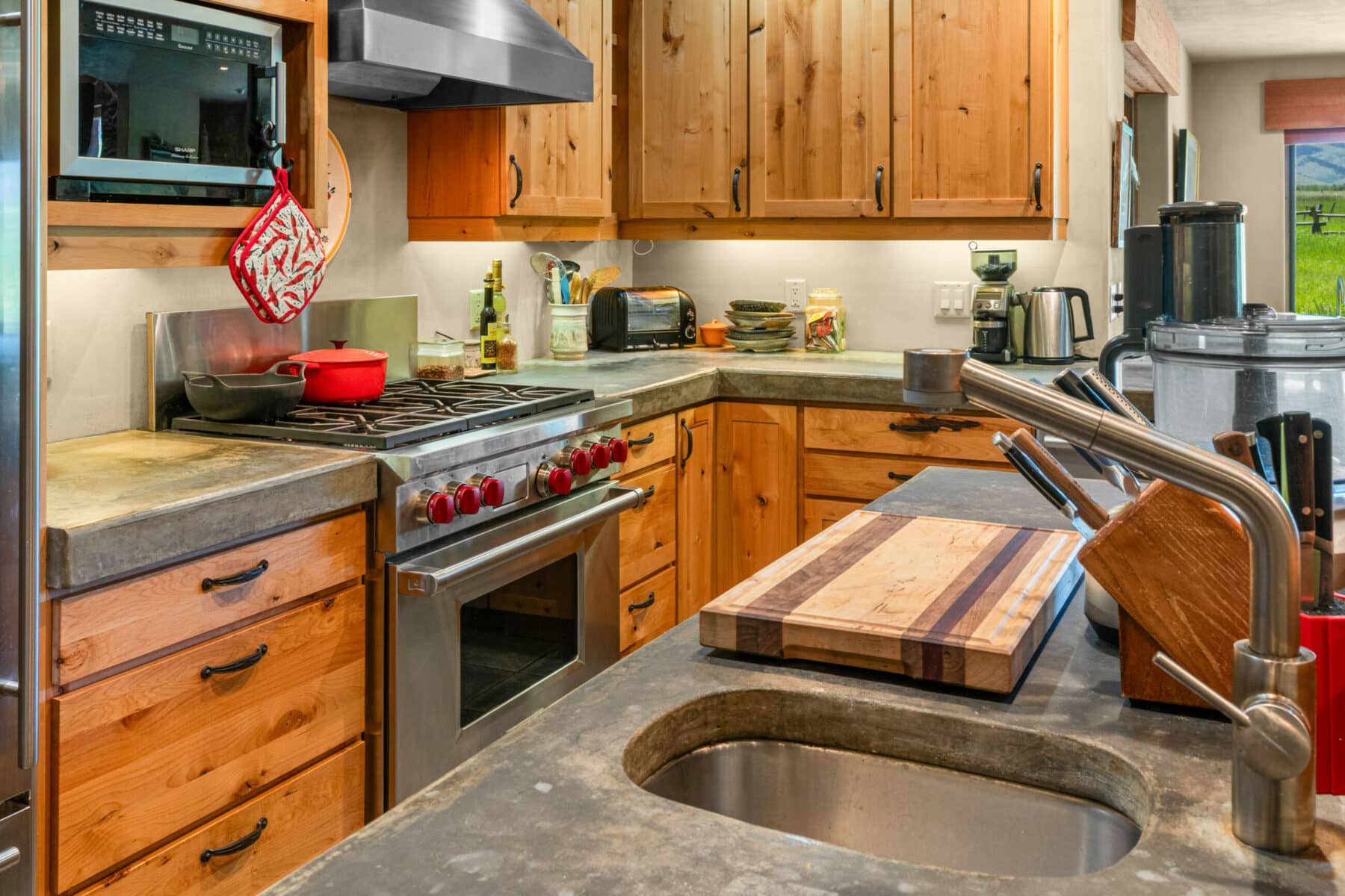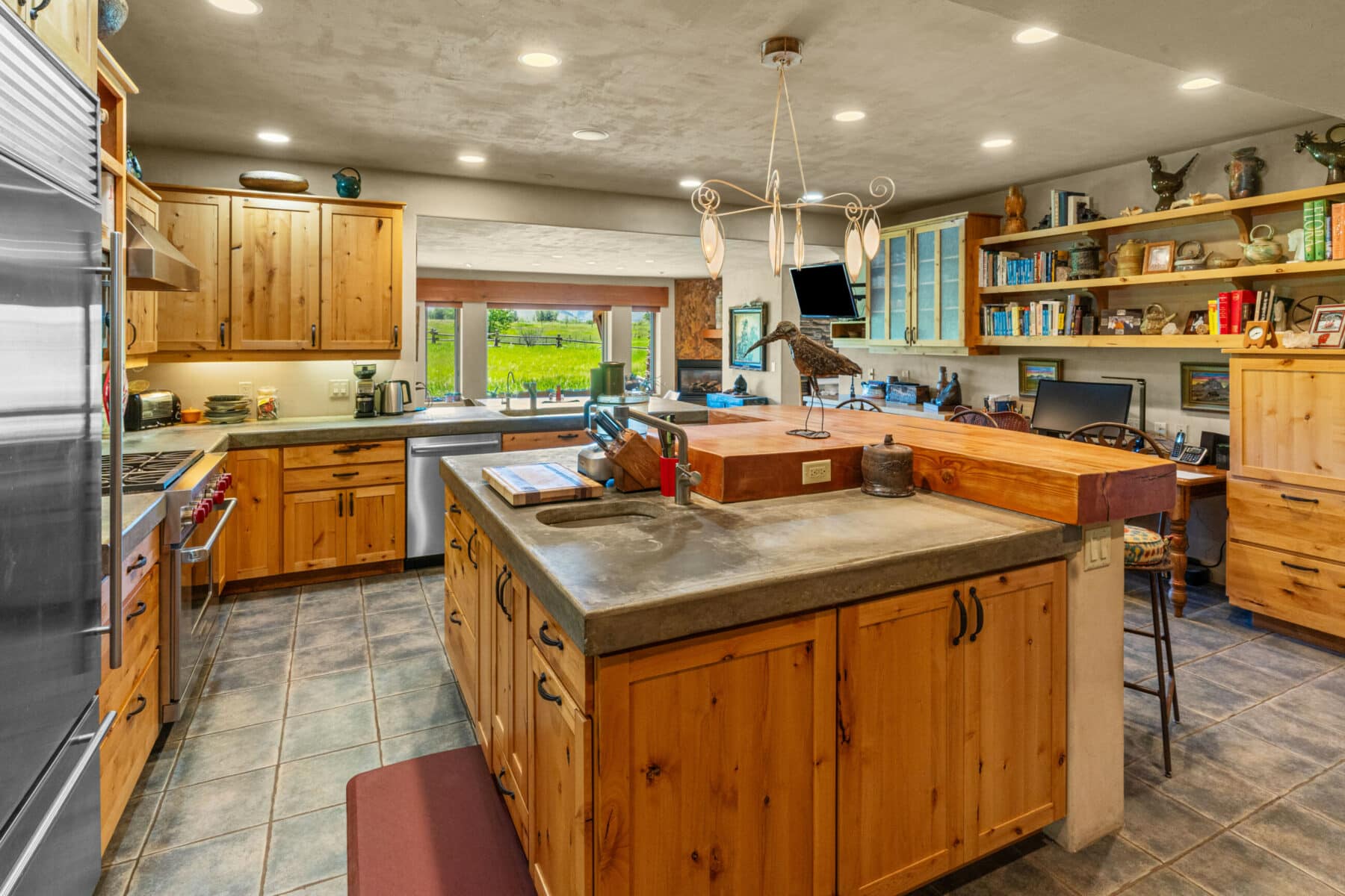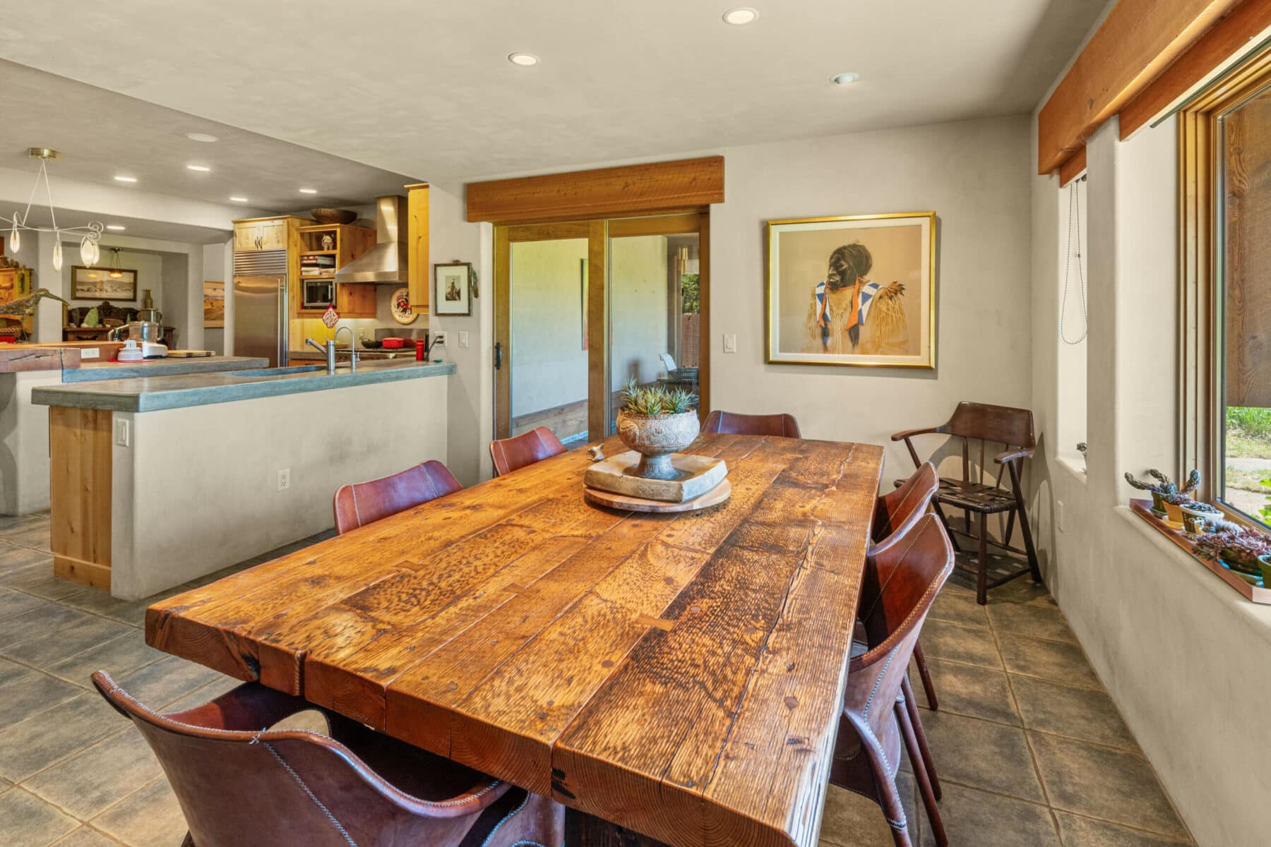 The wide entry opens into a beautiful kitchen with custom cabinets, stainless steel appliances, and concrete countertops. A large picture window lets natural light and afternoon sun into the dining area with unparalleled views of the Tobacco Root Mountains. The attached screened-in porch makes a great sitting/eating area. Across the kitchen through antique swinging doors is a large pantry.