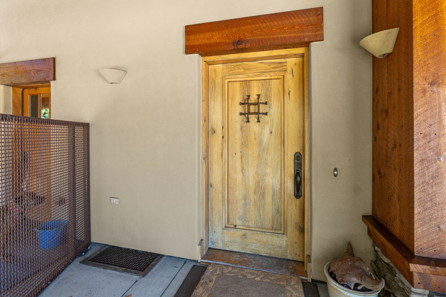 A custom 200-year-old white oak front door adorns the entry of this Montana modern ranch-style home. The 4,590+ square-foot custom home has three bedrooms and 2.5 bathrooms.