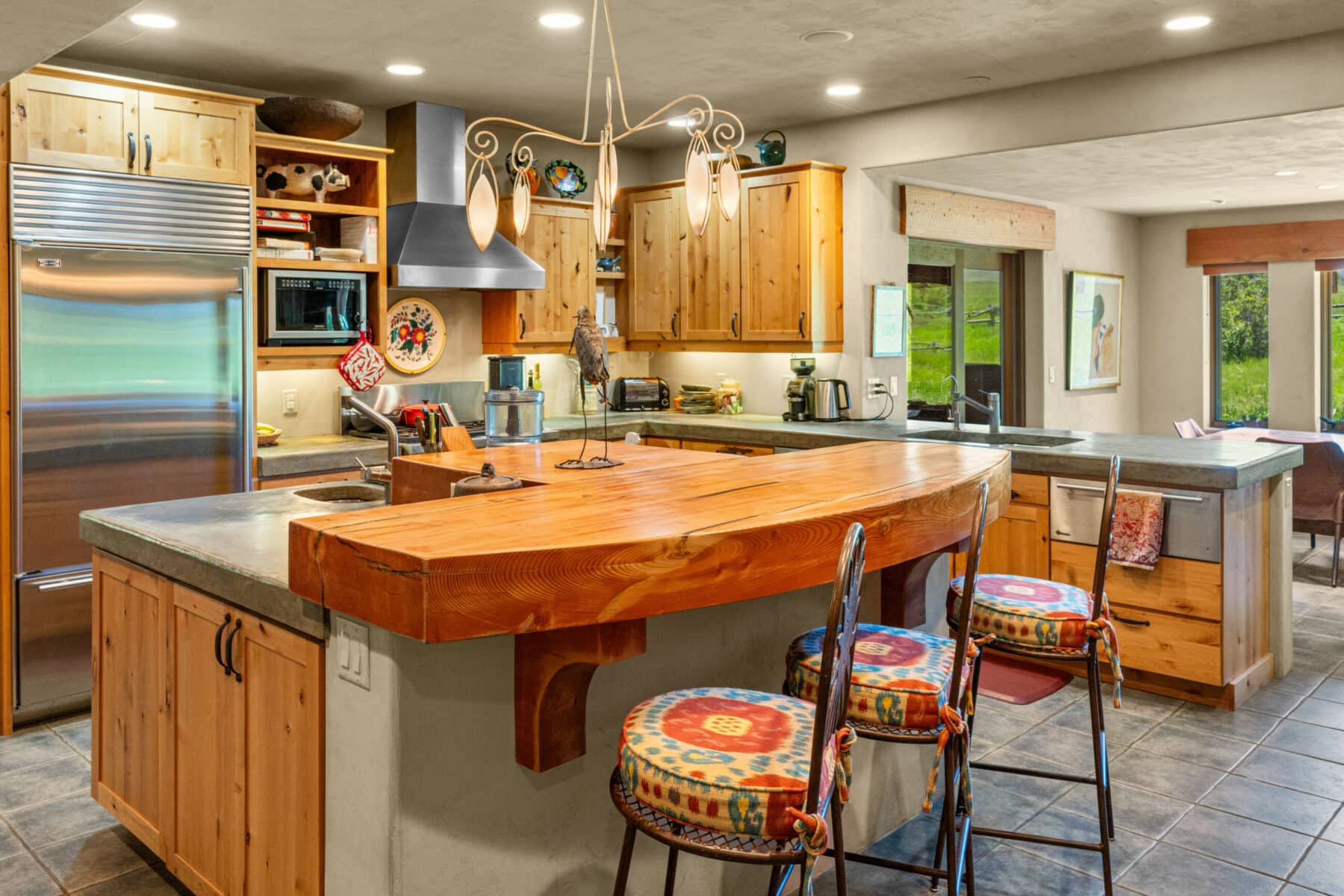 A large sitting area with vaulted ceilings and exposed beams surrounded by big windows opens to a covered terrace with an outdoor fireplace. The 8-foot overhangs keep the house shaded and cool during the summer months.