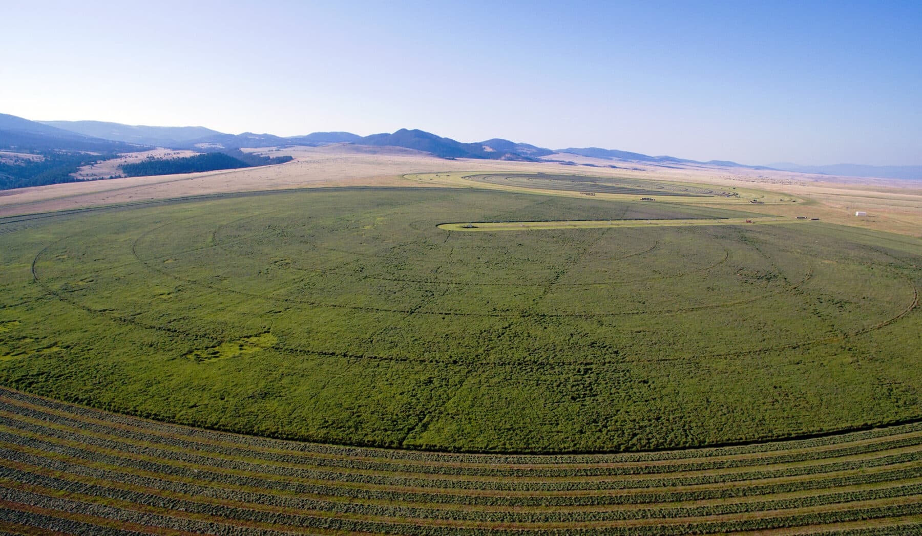 With a consistent soil profile, the irrigated ground has historically yielded around four to four-and-half tons of alfalfa hay per acre on two cuttings. The regrowth is typically utilized as high-protein irrigated-pasture grazing in the late fall when the cows are rotated from summer pasture, weaned, and shipped.